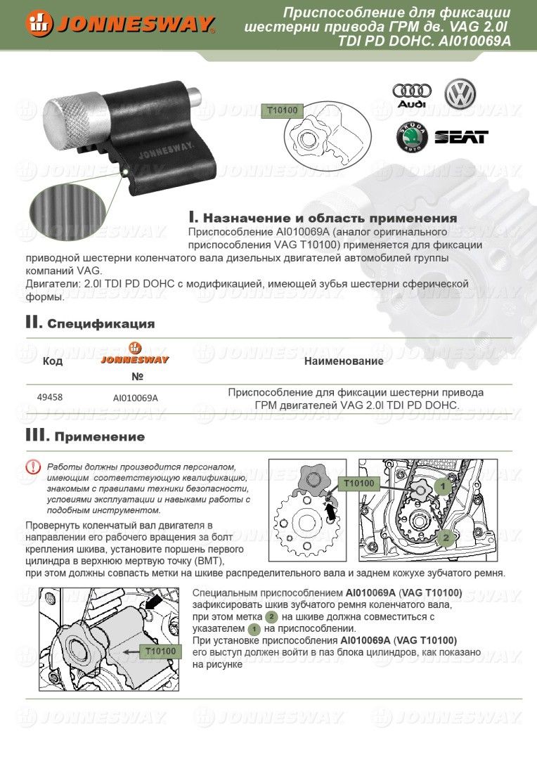 Инструмент Jonnesway AI010069A (оригинальный номер T10100) предназначен для фиксации приводной шестерни коленчатого вала двигателей автомобилей.