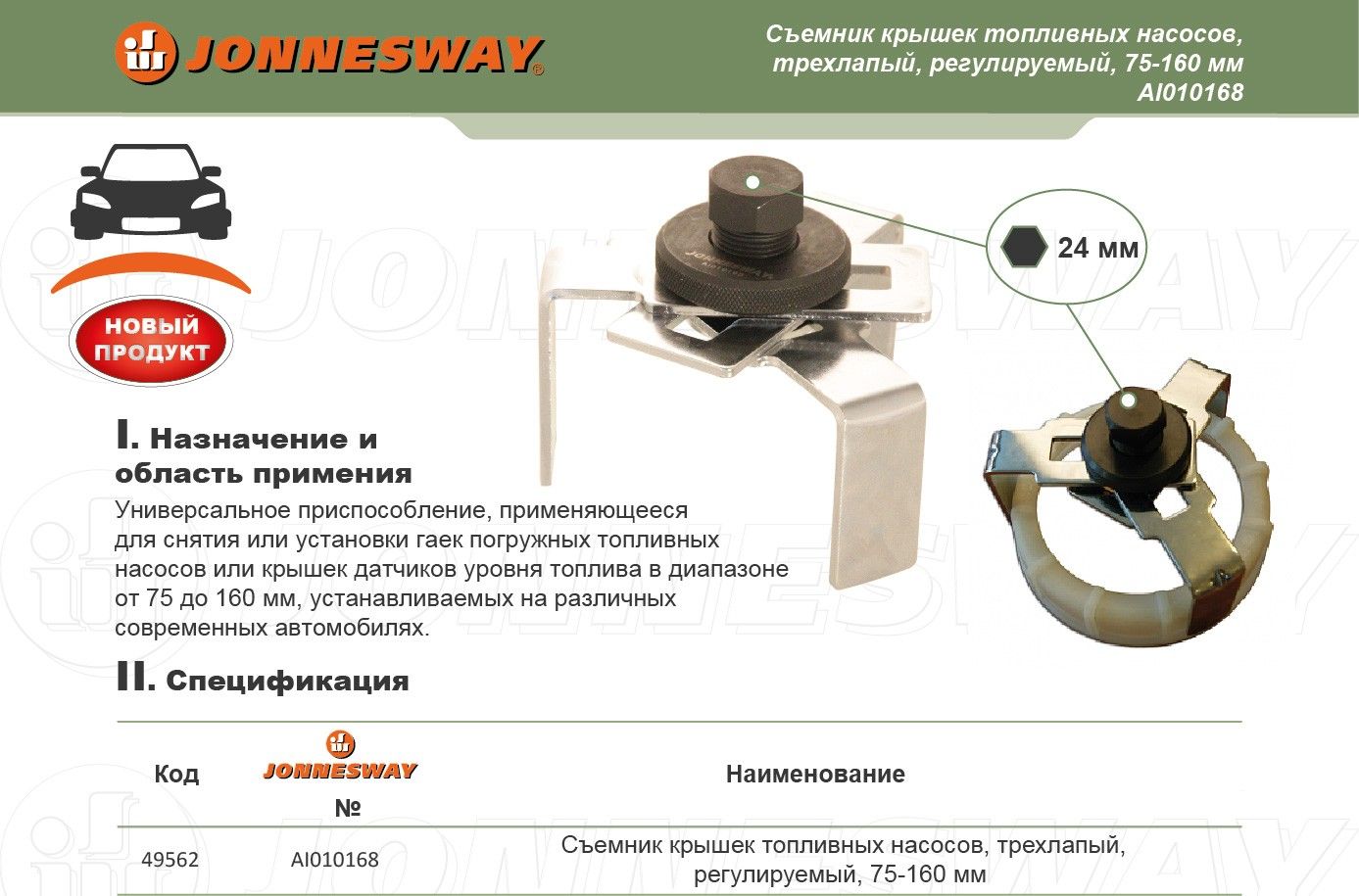 Съёмник Jonnesway AI010168 – инструмент с универсальным захватом для откручивания/закручивания плотно посаженных крышек топливных насосов. Съёмник снабжён тремя "лапами", которые обеспечивают надёжный трёхсторонний захват крышки. Шестигранный привод позволяет прикладывать значительное усилие при помощи ключа или трещотки с торцевой головкой. Широкий рабочий диапазон регулируемого крышкосъёмника Jonnesway варьируется от 75 до 160 мм и позволяет использовать его для демонтажа и установки крышек различных диаметров, которые используются на большинстве современных автомобилей.