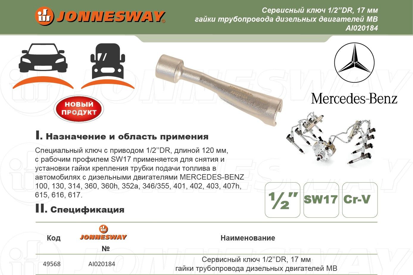 Сервисный ключ 1/2"DR 17 мм, гайки трубопровода дизельных двигателей МВ Jonnesway AI020184