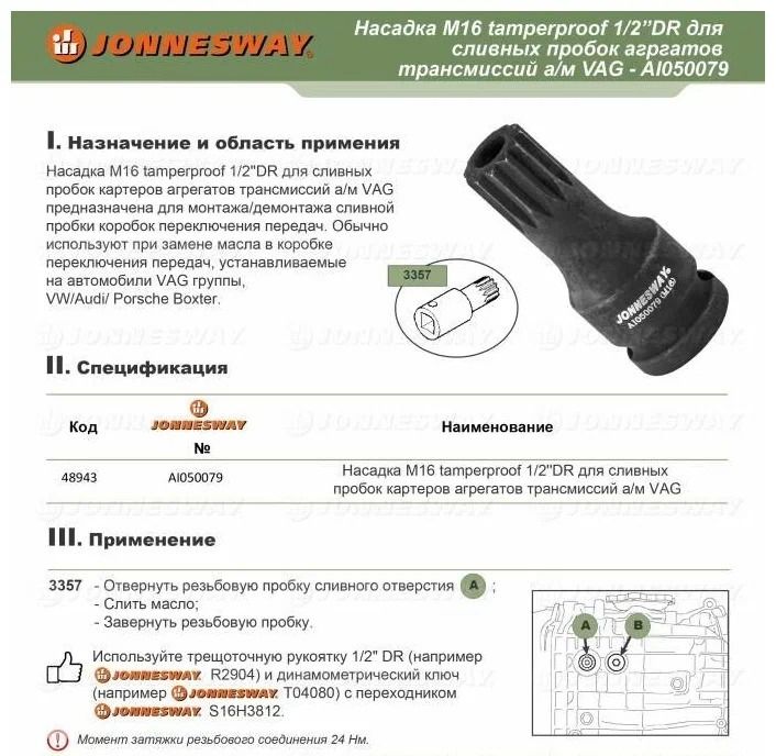 Торцевая насадка М16 Tamperproof Jonnesway AI050079 - ударопрочное приспособление, разработанное для закручивания и выкручивания сливных пробок при замене масла в а/м VAG (VW/Audi/Porsche Boxter). Рекомендуемый момент затяжки резьбовой сливной пробки картеров агрегатов трансмиссий автомобилей VAG составляет 24 Нм. Насадка для масляных пробок Jonnesway AI050079 изготовлена из прочной и защищённой от коррозии стали.