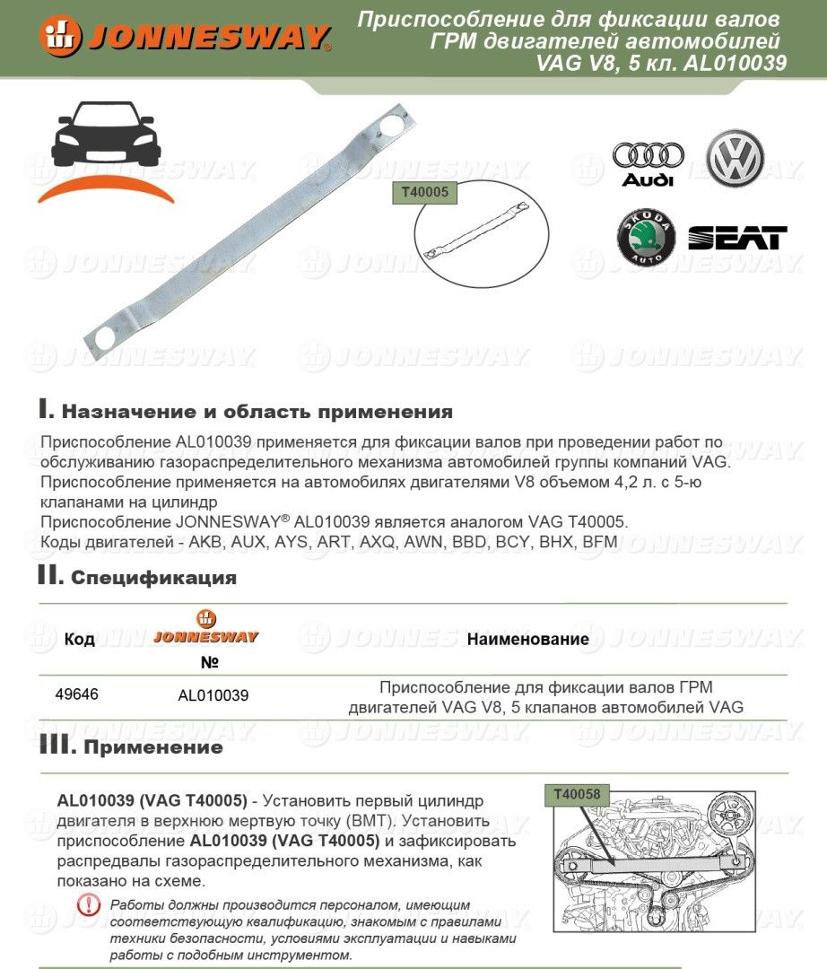 Фиксатор Jonnesway AL010039 (оригинальный номер T40005) - инструмент, предназначенный для установки валов ГРМ на автомобилях с двигателем V8 объёмом 4,2 л с 5 клапанами на цилиндр, относящимся к группе VAG.