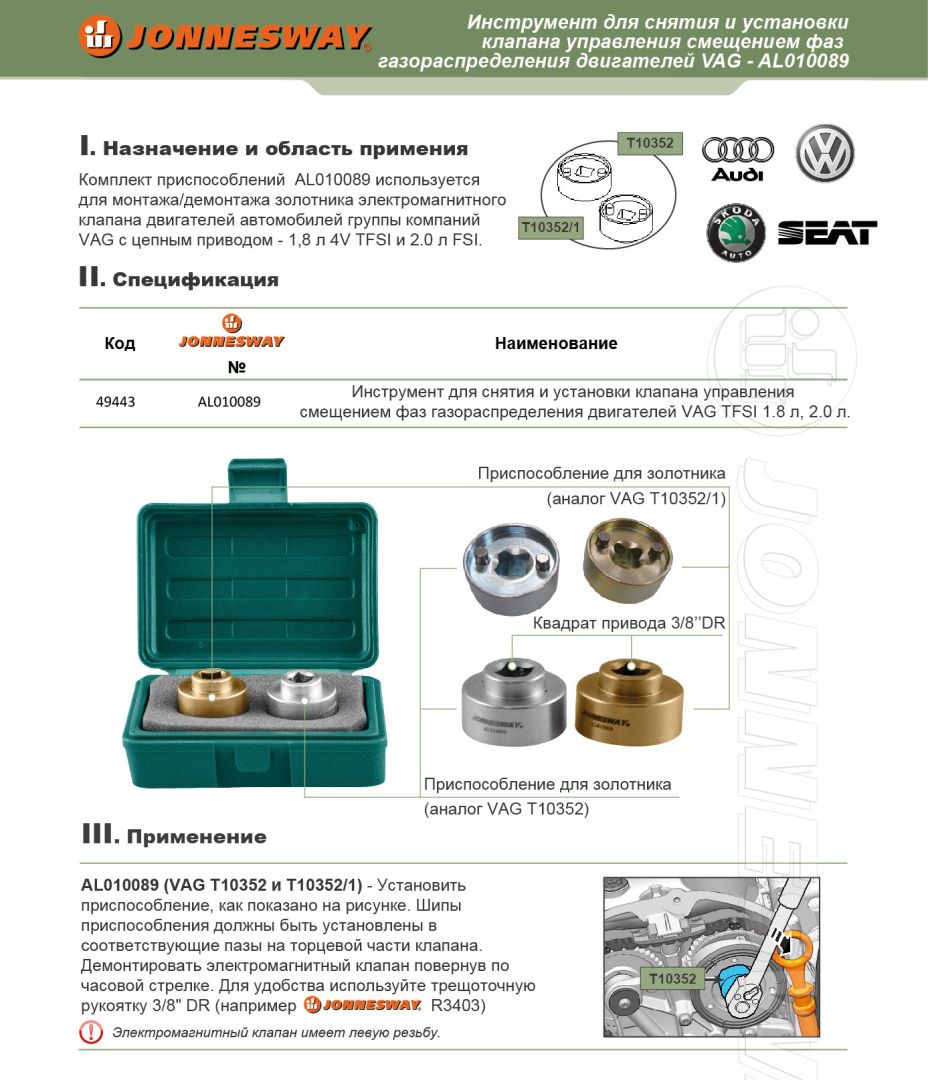Инструмент Jonneswway AL010089 представляет собой комплект приспособлений, предназначенный для золотника электромагнитного клапана системы смещения фаз ГРМ.