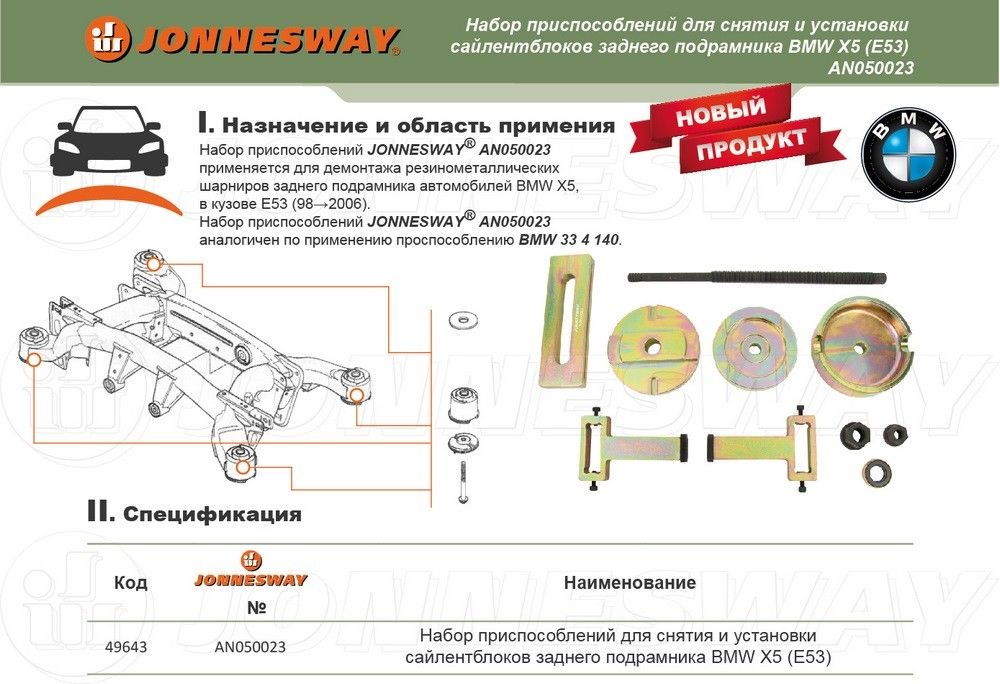 Комплект инструмента Jonnesway AN050023 (аналог BMW 33 4 140) предназначен для монтажа/демонтажа сайлентблоков заднего подрамника автомобилей.