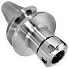 Данный патрон предназначен для тяжелых обрабатывающих центров с конусом шпинделя BT50, рассчитанных на максимальные крутящие моменты и большие усилия резания. Однако на таком мощном корпусе BT50 установлен цанговый механизм среднего размера ER32, предназначенный для точных работ с инструментом малого и среднего диаметра (3-20 мм) на крупном станке.