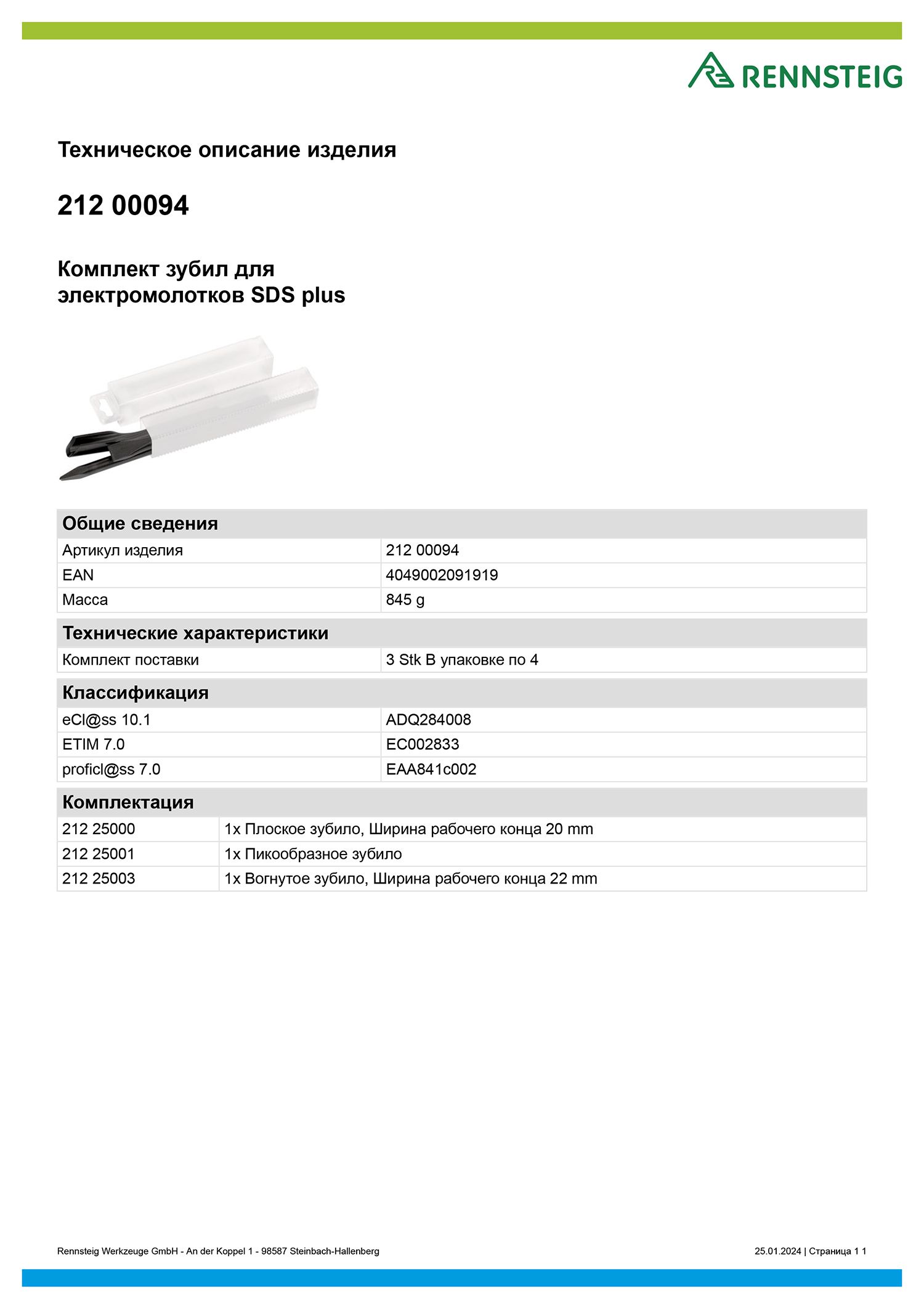 Набор зубил SDS-plus 250 мм, 3 предмета, Rennsteig RE-21200094, сталь Cr-V