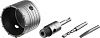 - В набор помимо коронки выбранного диаметра входит универсальная державка SDS-Plus, центрирующее сверло и специальный выбивной клин.