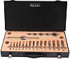 - Набор включает: метчики DIN 352, плашки DIN 223, воротки для метчиков DIN 1814: №1 и №2, вороток для метчиков с трещоткой, резьбомер, воротки для плашек.
