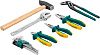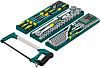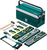 - Набор для промышленного применения со всеми основными инструментами: торцевые головки, биты, отвертки, бокорезы, тонкогубцы, клещи, молоток, ножовку по металлу, разводной ключ, адаптеры, удлинители и воротки