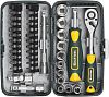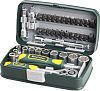 - Универсальный набор со всеми основными инструментами: торцевые головки, биты, адаптер, удлинители и трещоточная рукоятка