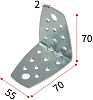 Крепежный усиленный уголок 70х70х55 мм с зенковкой (углубление под шуруп или саморез) служит для скрепления несущих элементов в подстропильной системе, а также для возведения деревянных сооружений, мебели и других конструкций. Выдерживает большие нагрузки, изготовлен из сертифицированной оцинкованной стали, которая не поддаётся коррозии и устойчива к изменениям климата. Подразумевает быстрый монтаж и надёжную фиксацию скрепляемых деталей. Изготовлен в соответствии с высокими стандартами международного уровня на современном оборудовании из высококачественной углеродистой стали толщиной 2 мм. Характеристики крепежа допускают его использование в слабонесущих конструкциях.
