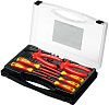 - В набор входит 7 инструментов: пассатижи, бокорезы, отвертки.