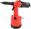 Процесс установки заклепки полностью автоматизирован - инструмент самостоятельно накручивает заклепку на рабочий стержень, а после обжатия автоматически включает реверс для выкручивания стержня из установленной заклепки. Корпус инструмента имеет отверстие для установки скобы, позволяющее подвешивать оборудование. Данный заклёпочник предназначен для профессионального использования в условиях производственных цехов и монтажных участков, где требуется высокая производительность и надежность соединений.