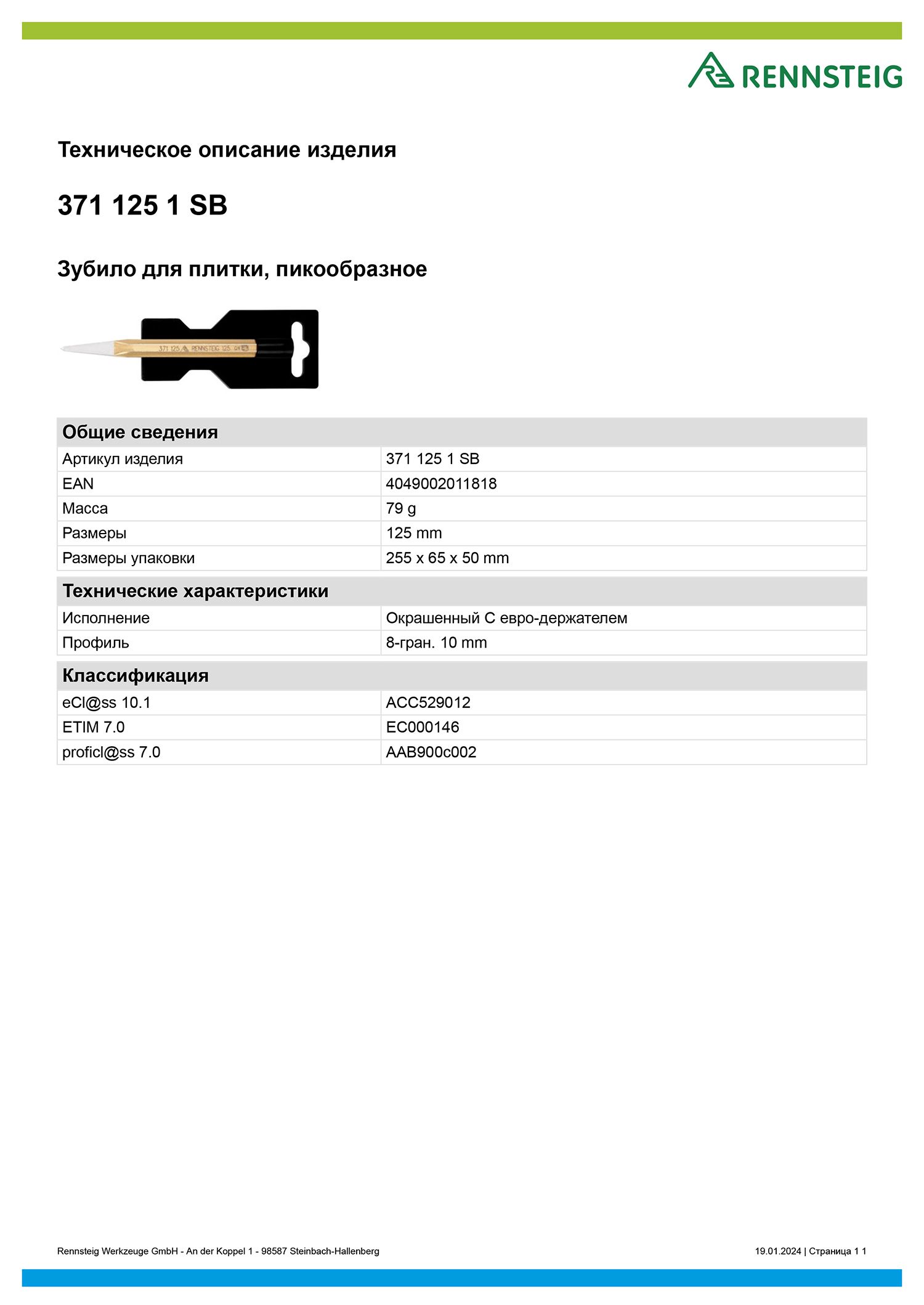Зубило для удаления плитки пикообразное с держателем 10х125 мм, 8 граней, Rennsteig RE-3711251SB, сталь Cr-V, лакированное