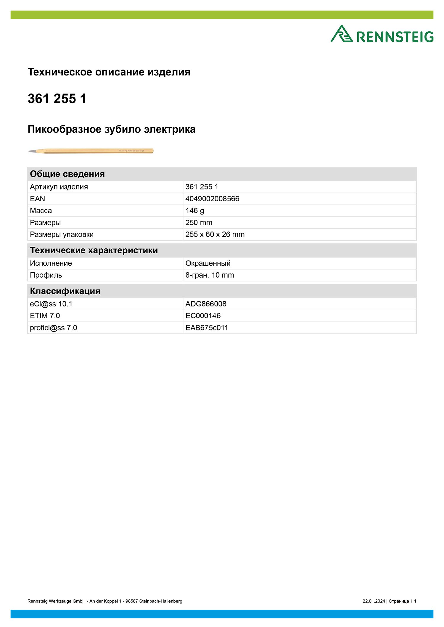 Зубило электрика пикообразное 10х250 мм, 8 граней, Rennsteig RE-3612551, сталь Cr-V, лакированное