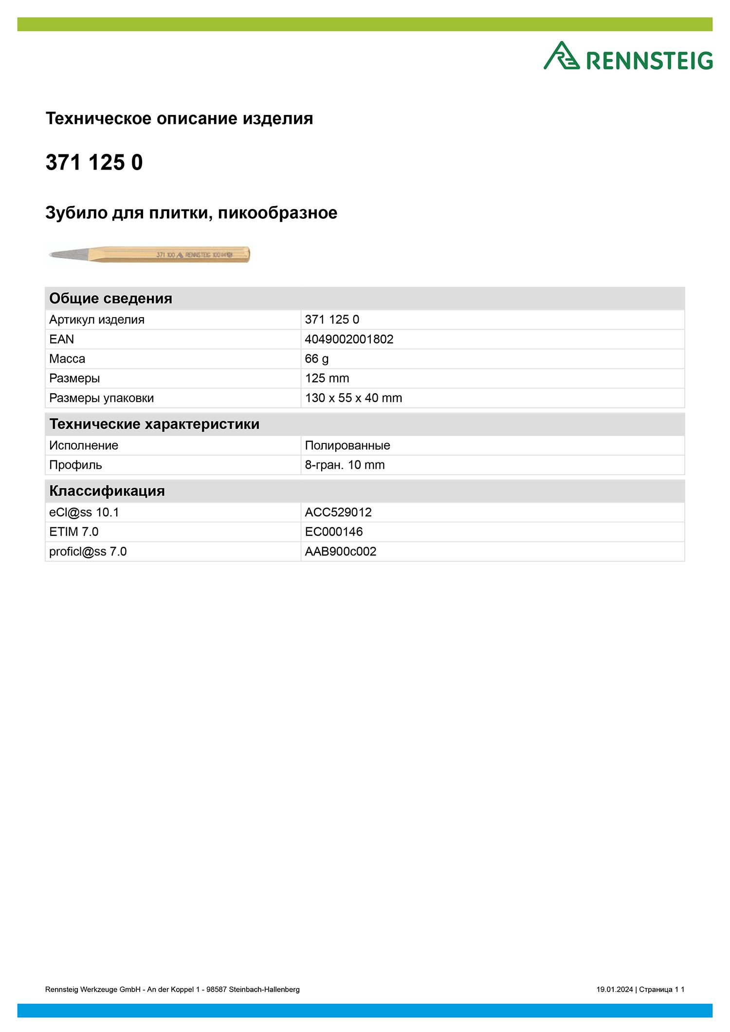 Зубило для удаления плитки пикообразное 10x125 мм, 8 граней, Rennsteig RE-3711250, сталь Cr-V, полированное
